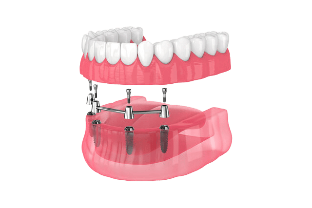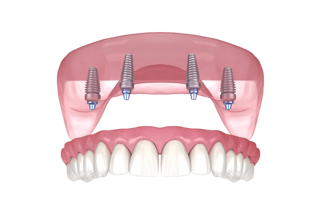 We will coordinate your treatment for implants to be surgically placed by a dentist or oral surgeon. Once the implants are integrated, the denture is constructed (or an existing denture is modified) to include the implant parts. The denture then snaps into place on the implants or bar creating a secure, non-mobile fit.